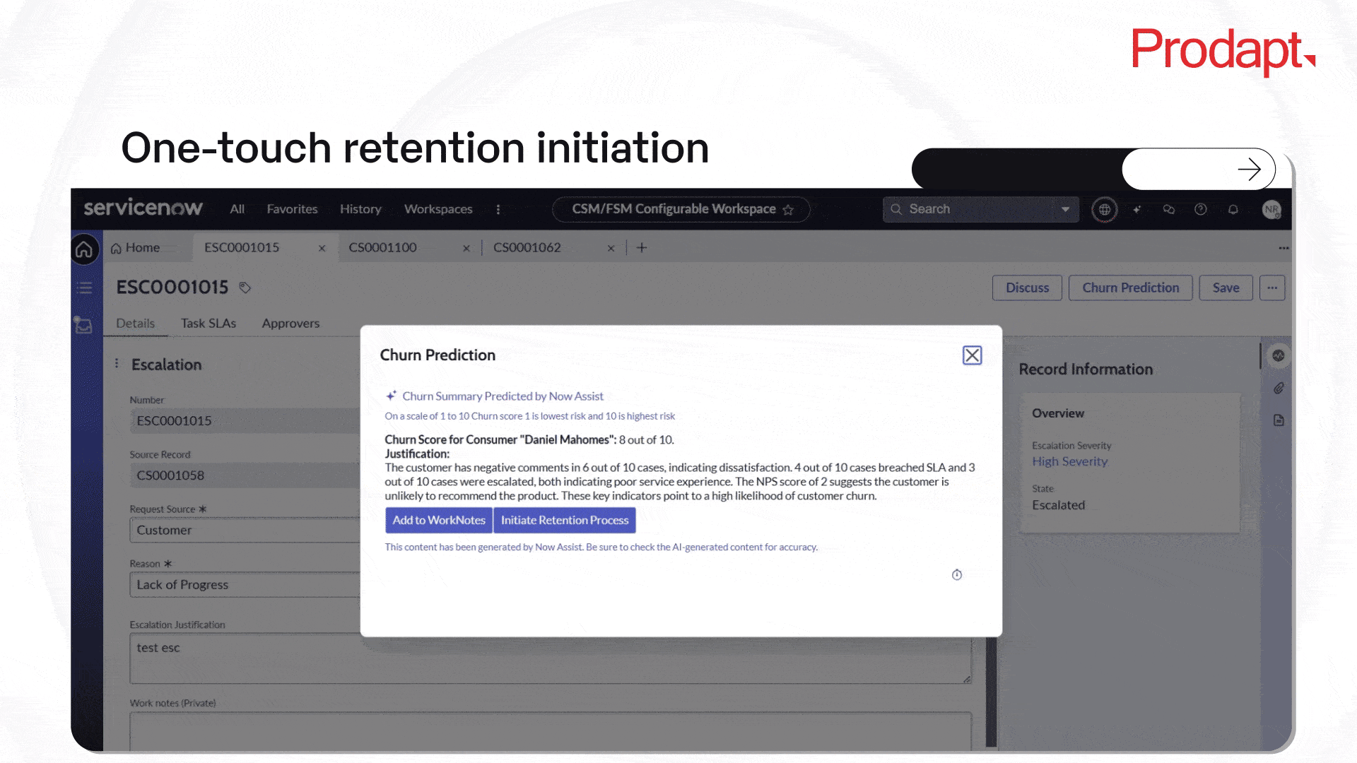 GenAI-powered churn prediction score, leveraging insights from case history, escalation records, SLA violations, chat sentiment, customer interactions, and other relevant factors.