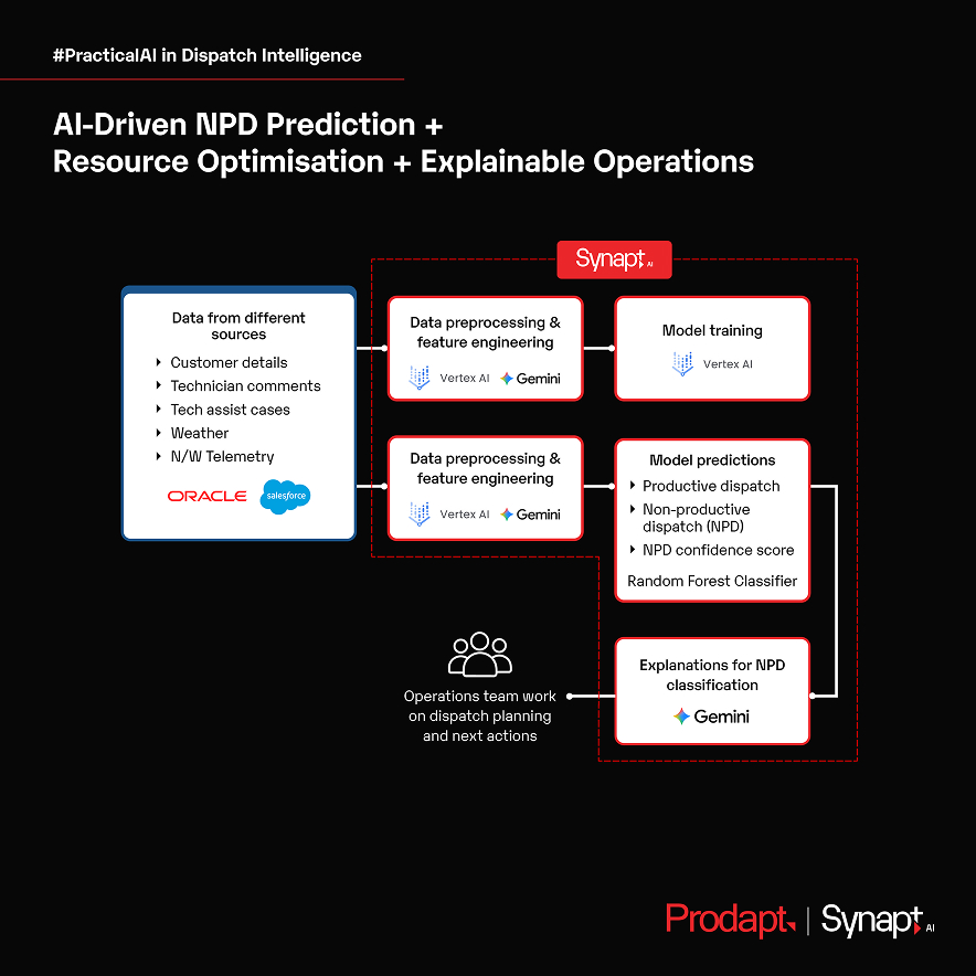To break this cycle, Prodapt engineered an AI-driven dispatch intelligence platform powered by Synapt AI, purpose-built for large-scale telecom field operations.